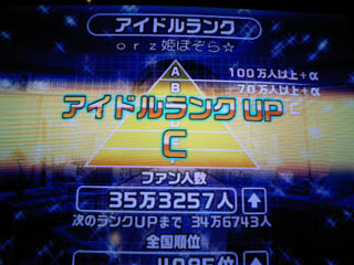 さて、雪歩ソロユニット「orz姫ぼぞら☆」の現状はDランク、残り5週で8万5千人、イメージレベル5。絶対厳しい・・・。2万5千人を取るのがやっとの現状ではもう負けられない。そんな感じでワクテカ状態で2万5千人のオーディションを受ける。がしかし、無残にも敗北を喫する。戦略が中途半端すぎた。5位に沈んでしまった。もう後がなくなった。これはもう、最後に賭けるしかないようだ。そこから思い出稼ぎに2週レッスン。そして、曲チェンジ。大好きな「魔法をかけて!」にした。これでボーカルの大幅なブーストがかかる。そのかわりダンスは大幅に下がった。これで勝負だ!残り2週で2万5千人を受けて、何とか3位で通る。そして、残り5万7千人で向かえたランクアップリミット。これで上がれなければ活動終了。もはや10万人を獲得できる「Long Time」しかない・・・。しかし、合格枠は1人。イメージレベル6の雪歩では勝てる見込みは皆無。そこで、さらに衣装で微妙に補正をかけてレッツダイブ。覚悟を決めるしかない。ゲージは流行1位のボーカル一点集中で、他はかなり低いが・・・。しかし審査員の興味が見られないLong Time。ジェノサイドが怖い。非常に厳しい戦いだけど・・・やるしかない。ボーカルメインで勝負!1次審査。ボーカルの5点のみ。他が取れず。や、やべぇー。2次審査、ビジュアルは抑え目で、ボーカルとダンスを叩く。結果、ボーカルとダンスの計8点。この時点で1位。いける!? 3次審査。ジェノサイドが怖いので早めの思い出使用。GOODアピール。そしてボーカル、ダンスを取りに行く。頼む、ボーカル審査員帰らないでー!帰ったら負け確定だから(涙)そんな願いもむなしくCPUのbadアピール攻撃(汗)うわぁぁぁぁん!そして、そして9回目のアピール・・・なんと、ボーカル審査員生き残った!そして、ボーカルとダンスの8点プラス。もしかしたらもしかするかも・・・。祈るような気持ちで発表待ち。頼む!通って! この時ばかりはマジで祈りポーズでした。なんと・・・通ったよ。合格。夢じゃないよね? やった。やったよー!(涙)周りを気にせず「よっしゃあああ!」とガッツポーズ。人が少なくてよかったです(笑)奇跡は起こりました。もう「起こらないから奇跡って言うんですよ」なんて言えませんね(笑)そして、10万人プラスされ、念願のCランクへ。次のランクアップまで35万人・・・12週で? 無理ーっ!(涙)でも、Cまで行けたのは正直嬉しい。前のユニットはことごとくEランク止まりだったから・・・。この喜びに少しだけ浸らせてください。そして明日からまた再び戦いの日々へ戻ろう。雪歩、よくがんばった。えらいぞ!